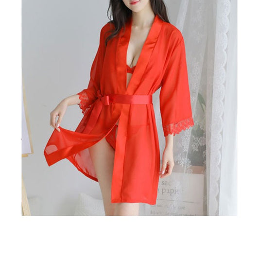 Red Transparent Lace Nightgown Robe Sleepwear With Bikini for Women